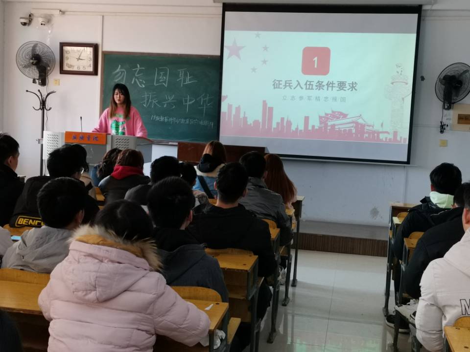 活动伊始,由团支书张文秒向同学们介绍活动流程。接着,张文秒同学通过PPT为同学们为大家详细解读了征兵入伍条件和政策,同时使同学们了解了军人的职责:巩固国防,抵抗侵略,保卫祖国,保卫人民的和平劳动,参加国家建设事业。然后,同学们一同观看了南京大屠杀死难者国家公祭仪式视频,庄严的公祭仪式让同学们深深震撼,意识到青年人应秉承先辈遗志,担起发奋图强,振兴中华的责任。随后,在团支书张文秒的带领下,同学们积极交流讨论,纷纷上台发言,现场气氛热烈。最后,由张文秒同学总结此次活动,号召同学们要铭记历史,落后就要挨打,时刻不忘民族复兴。