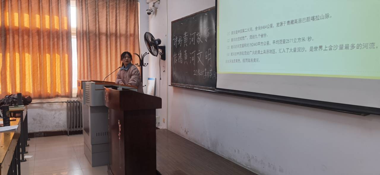 活动伊始,马柳柳同学以传承、保护、弘扬黄河文化为切入点,用自己独特的视角,向同学们讲述了“黄河故事”的主题内容。随后,团支书马柳柳为同学们播放了“黄河故事”的相关视频,视频中通过历史的再现、数据的引用,对黄河流域的人物故事、文化艺术以及黄河文明追本溯源。通过观看视频,同学们感慨于黄河的波澜壮阔,也对劳动人民治理水患过程中表现出来的大无畏精神表示由衷的钦佩。紧接着,学生代表胡耀阳同学上台进行发言,他表示深刻地认识到了黄河文化是中华文明的重要组成部分,是中华民族的根和魂。最后,团支书马柳柳对此次团日活动进行总结,并要求同学们要延续历史文脉,坚定文化自信,为实现中华民族伟大复兴的中国梦凝聚精神力量。